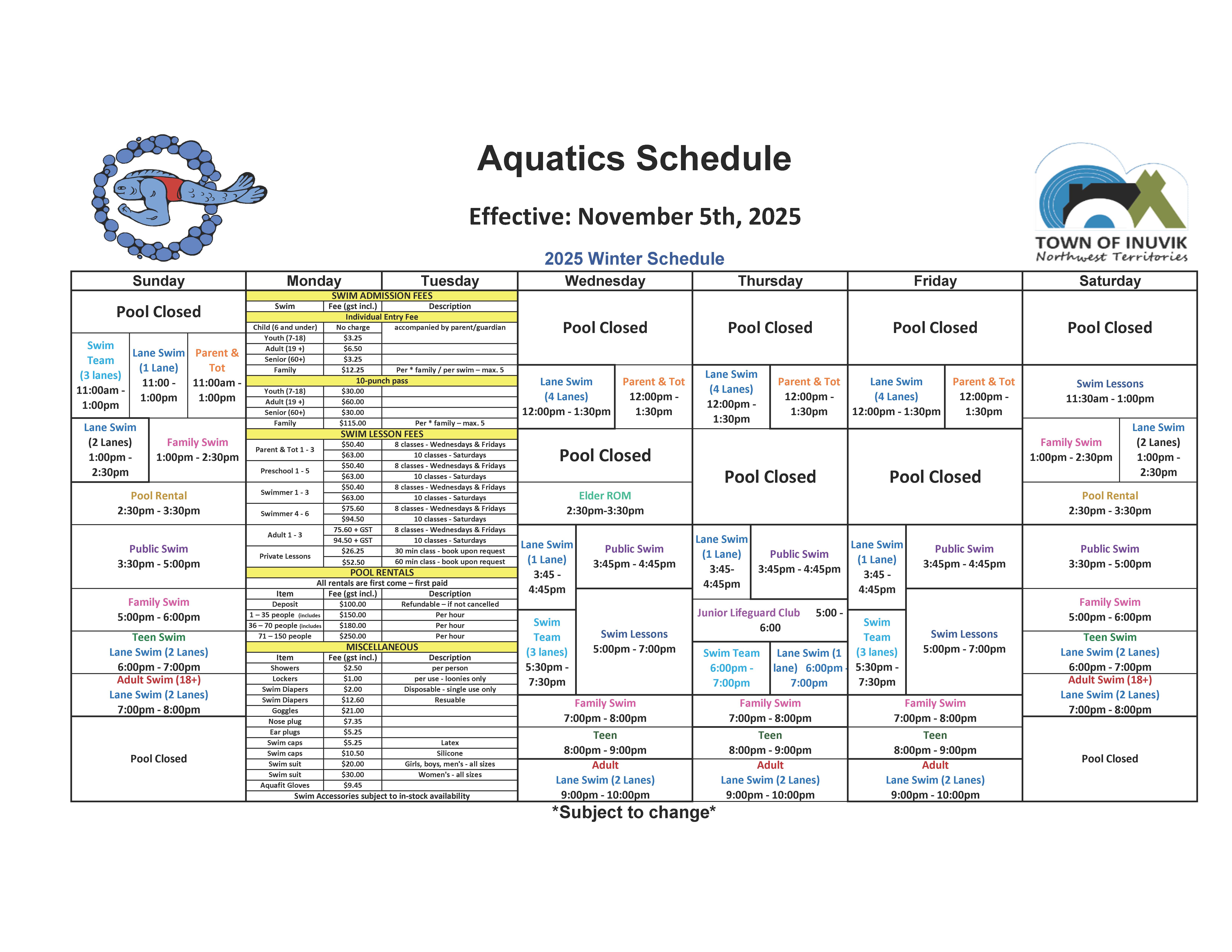For more information or to book rentals, please call the front desk at 867-777-8640. For more information about aquatic programs and lifeguarding courses, please e-mail the Pool Supervisor or phone 867-777-8642.