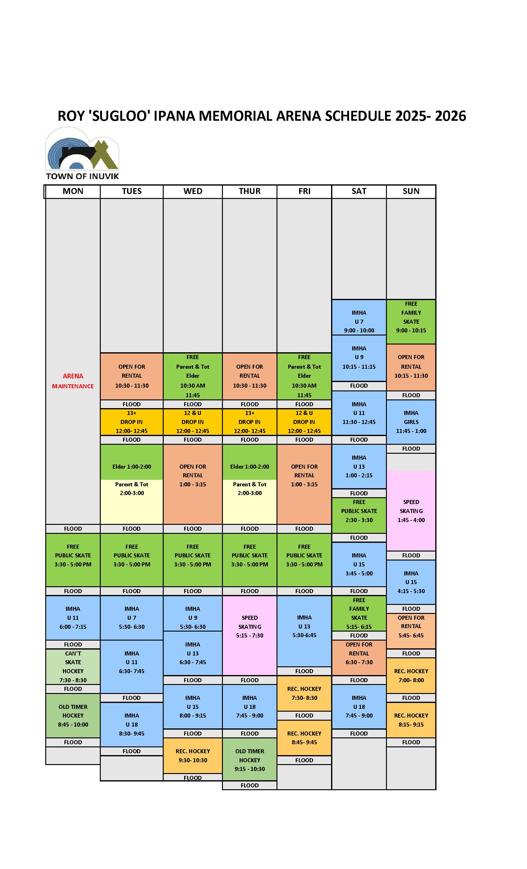 The arena is home to Inuvik's minor hockey, speed skating club, Old timer hockey, Recreation Hockey and Can't Skate hockey. An arena scheduling meeting is held each September. Clubs interested in participating should contact the MSC at 867-777-8609 or email recreation@inuvik.ca.