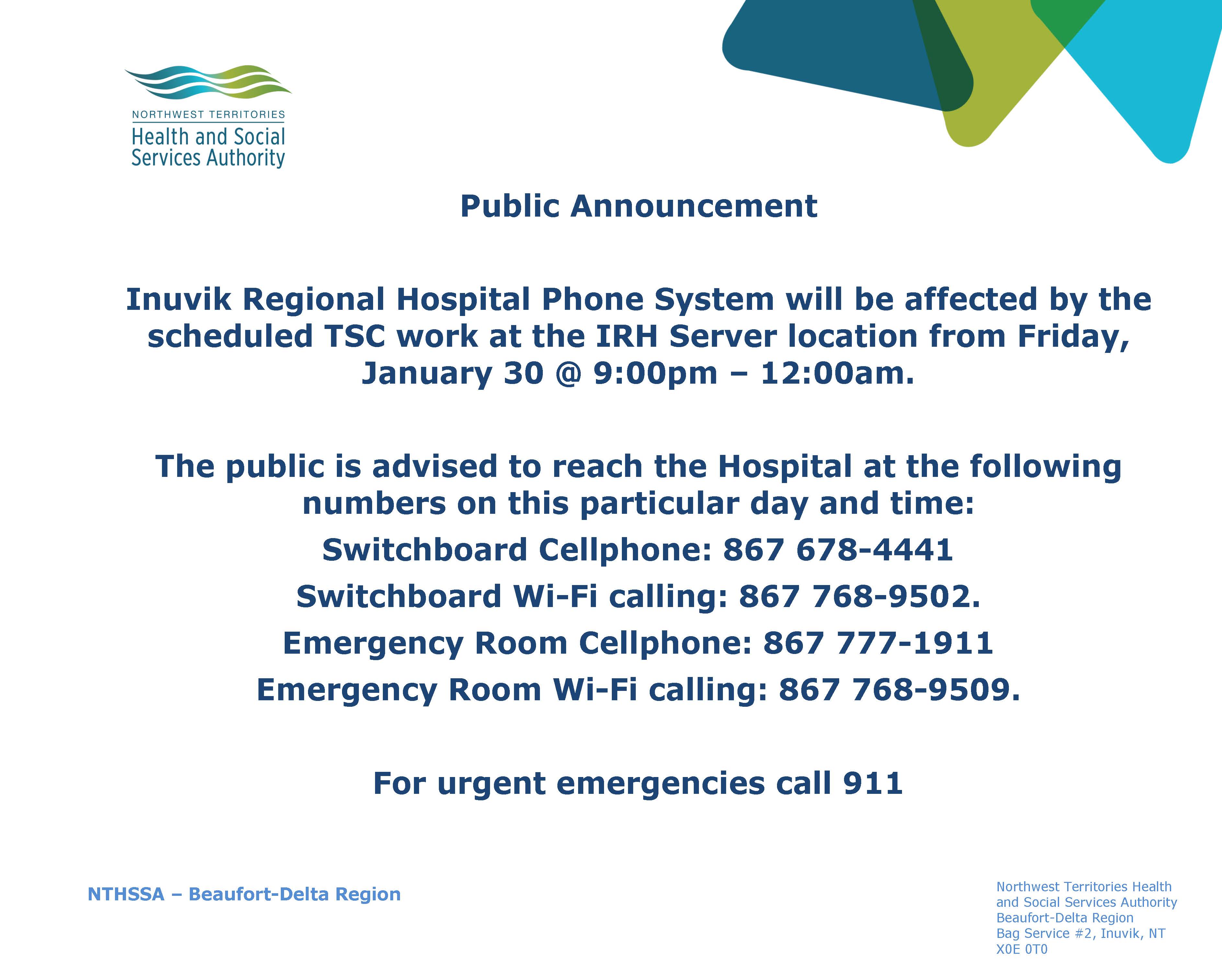 Please be advised the Inuvik Regional Hospital phone system will be affected from Friday, January 30 from 9PM to 12AM