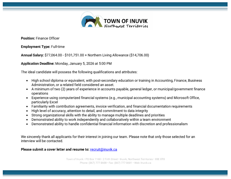 For further information regarding employment with the Town of Inuvik, please feel free to reach out to our Human Resources Manager at recruit@inuvik.ca